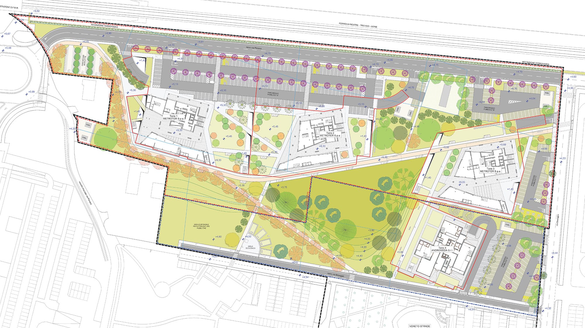 The intervention area (40,000 square metres) is located in the “heart” of a larger area for various economic facilities within which, in the last twenty years, the most important commercial structures north of the city of Mestre were constructed.