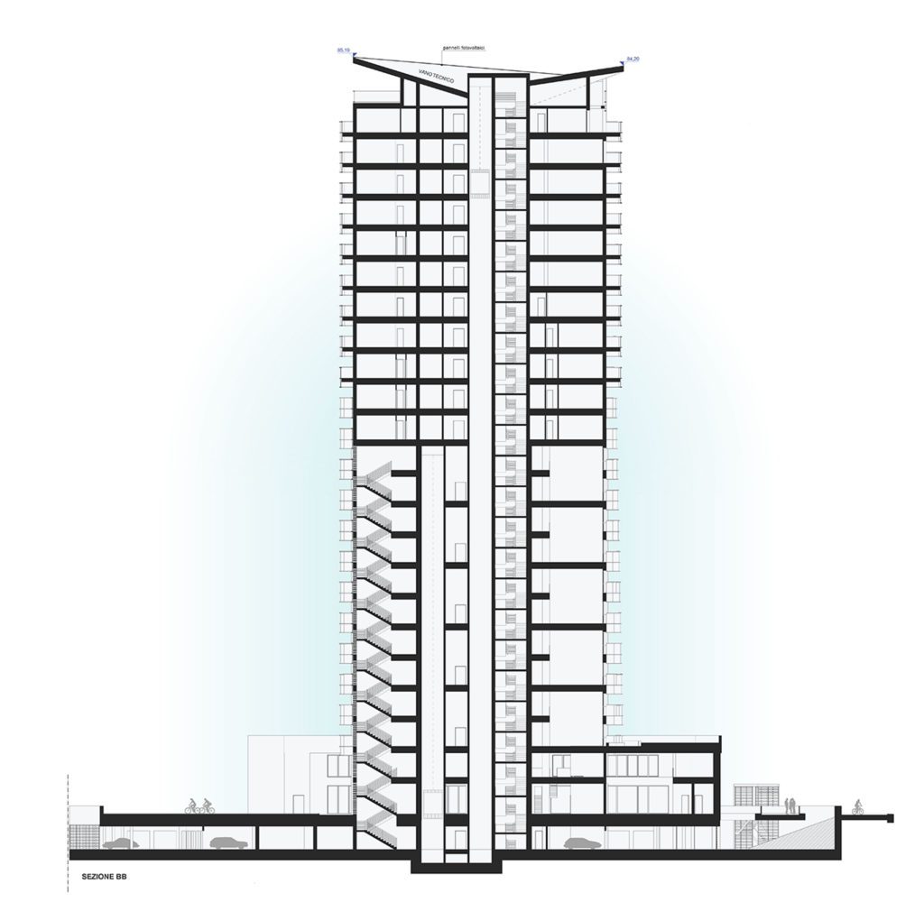 The elements that characterise the design are the “white and glass ribbons” of the parapets of the terraces. These ribbons, in fact, following the irregular pattern of the terraces, design a building with a variable geometry that wants to depart from the “box” effect that often characterises tower buildings. In addition, the sculptural aspect of the building is further accentuated by the play of shadow and light that arises from the rhythmic sequence of the terraces. The arrangement of the solids (photocatalytic concrete panels) and the voids (glass) increases the compositional dynamism of the terraces and favours the visual permeability between the inside and the outside, especially for the main rooms of the residential apartments, such as the living area and the master bedroom.
