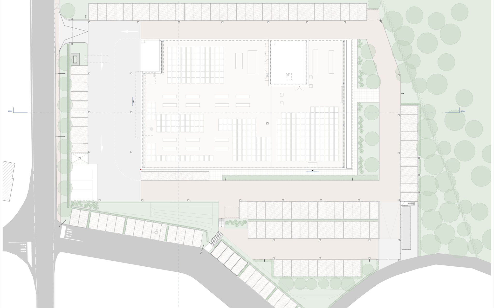 L’edificio è dotato di accessi separati per i flussi carrabili e pedonali, così da ottimizzare la gestione di persone e merci. Al piano terra si collocano l’area produttiva, i magazzini, gli uffici operativi, gli spogliatoi, i servizi igienici e il refettorio con 88 posti, oltre a un foyer di accoglienza. Il primo piano ospita gli uffici direzionali, una sala riunioni, un’area break, l’archivio e ulteriori spazi destinati alla produzione.