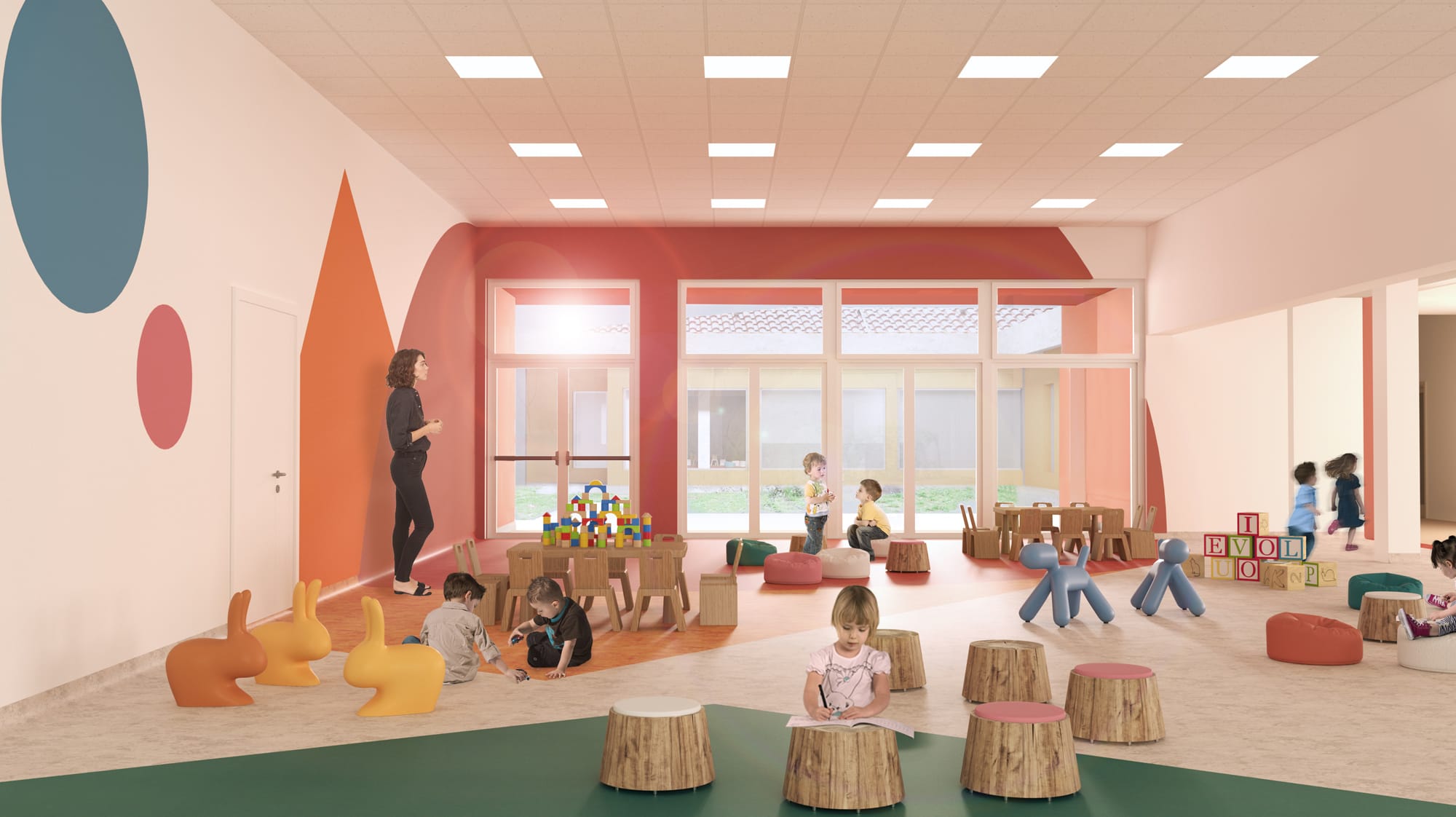 Infine, le problematiche che hanno interessato una porzione dell’edificio ospitante la scuola materna e le mutate esigenze scolastiche hanno richiesto la demolizione di una porzione danneggiata del fabbricato e la sua successiva ricostruzione. Il progetto di ricostruzione della nuova porzione di scuola materna ha previsto la realizzazione di una nuova sala comune, due aule con i relativi servizi e una sezione integrata tra nido e scuola dell’infanzia per una superficie totale di circa 650 m². Il nuovo corpo si inserisce rispettosamente in un contesto su cui grava un vincolo paesaggistico, donando però una sede moderna e funzionale agli abitanti di Castiglione del Lago.