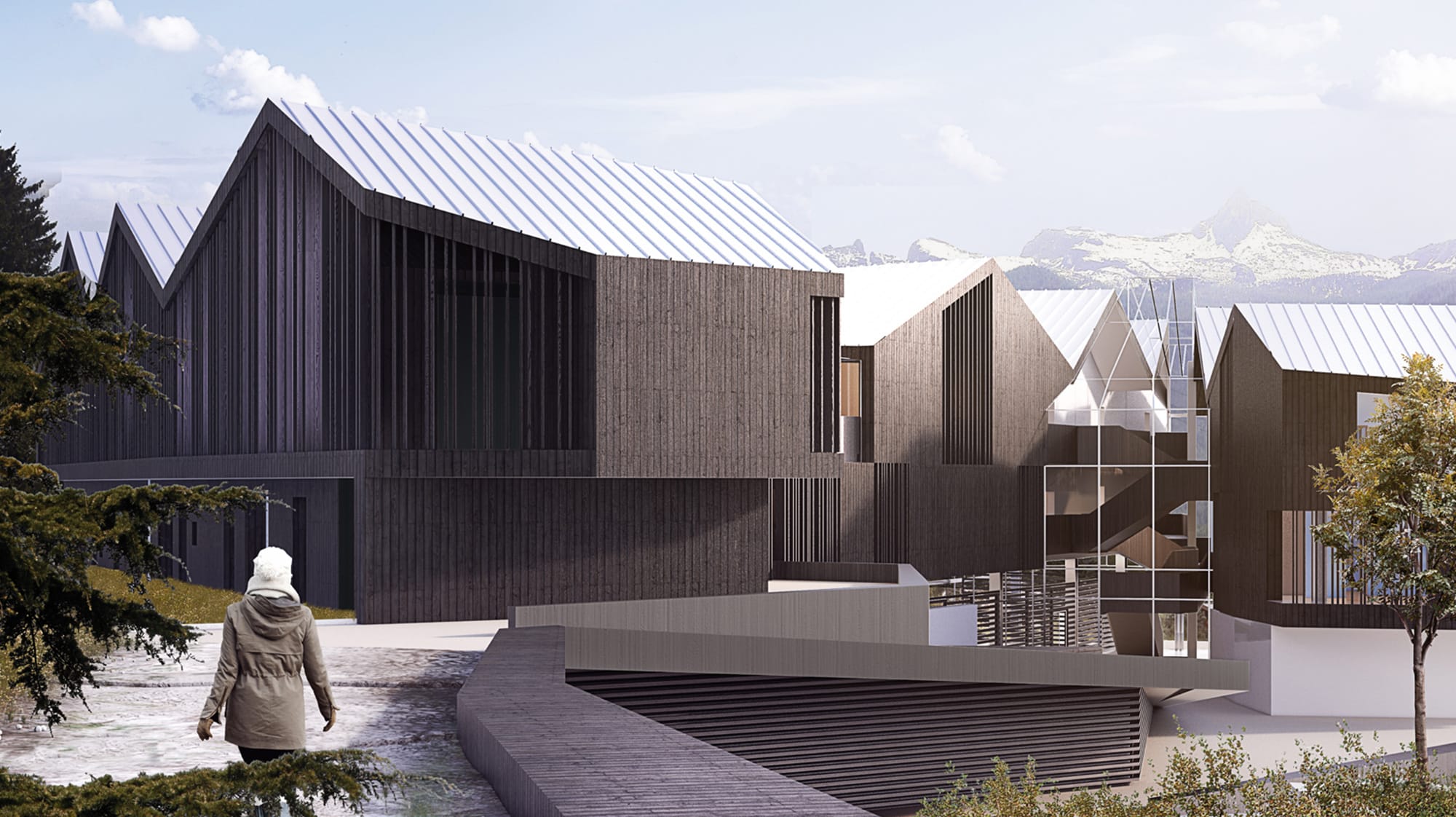 In una configurazione di volumi che ricordano fortemente gli antichi borghi di montagna, infatti, il progetto interpreta lo spazio dell’ingresso alla Senior City come una vera e propria corte, sulla quale si affacciano le unità residenziali.