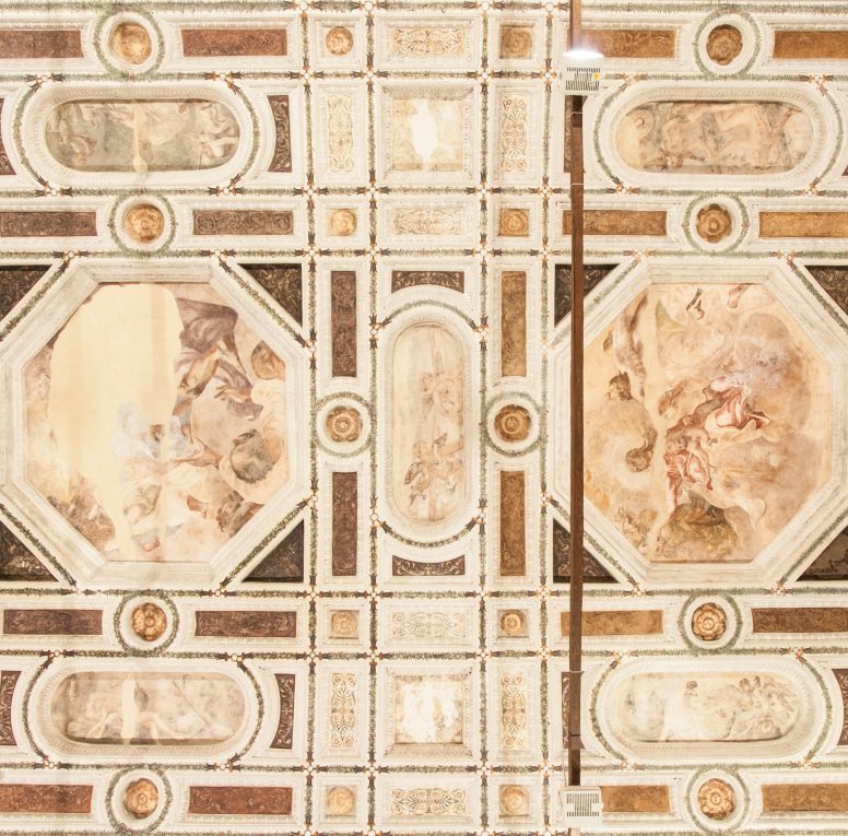 Restauro del controsoffitto ligneo: stuccatura fessurazioni con impasto di resine e polvere di legno e integrazioni cromatiche con vernici compatibili a quelle esistenti dove presente esfoliazione.