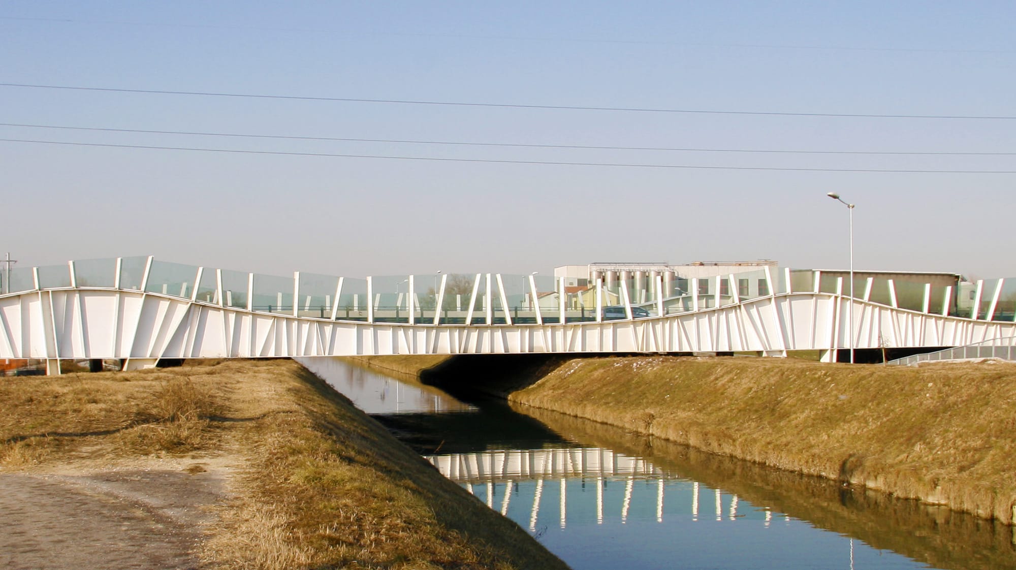 Il ponte, a scavalco del canale Taglio e della strada provinciale che collega Mira a Mirano, è in struttura metallica a tre campate, per una lunghezza totale di 88 m ed una larghezza complessiva di 37 m. Il ponte è composto da due travi in acciaio sagomate poste ai lati e da una trave a cassone nella mezzeria. Le nervature verticali delle travi principali, che trovano continuità nei montanti delle barriere fonoassorbenti, rappresentano il canneto.