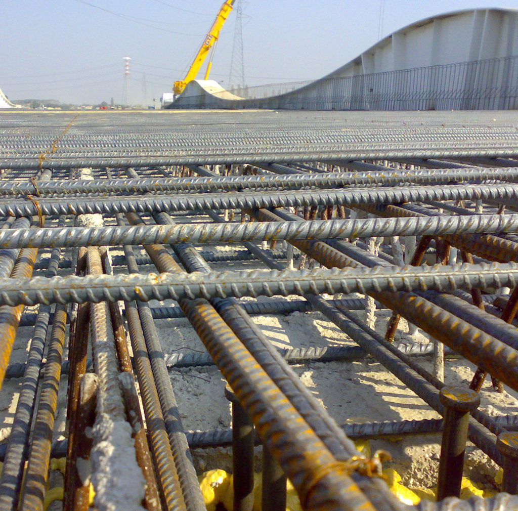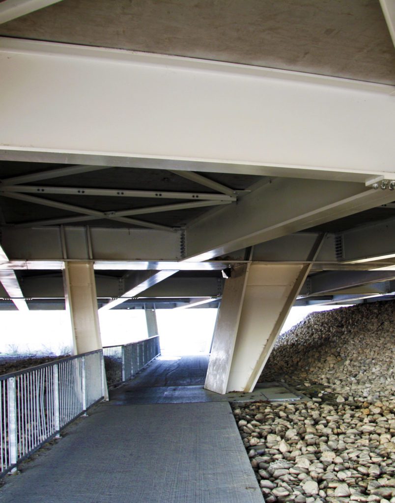 L’impalcato è stato progettato in struttura mista acciaio / calcestruzzo. Per rendere più veloce l’assemblaggio, i nodi di collegamento tra traversi e travi principali sono stati calcolati per essere imbullonati.